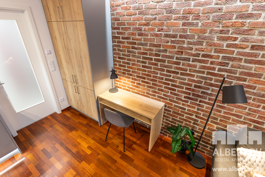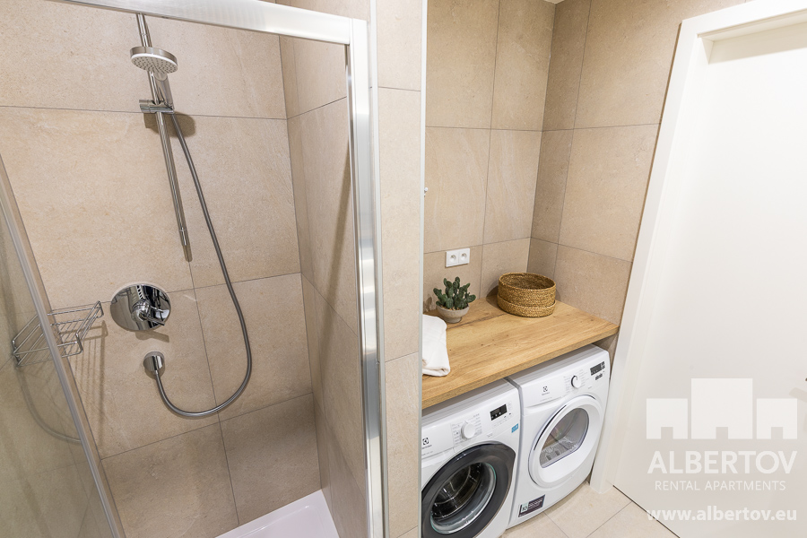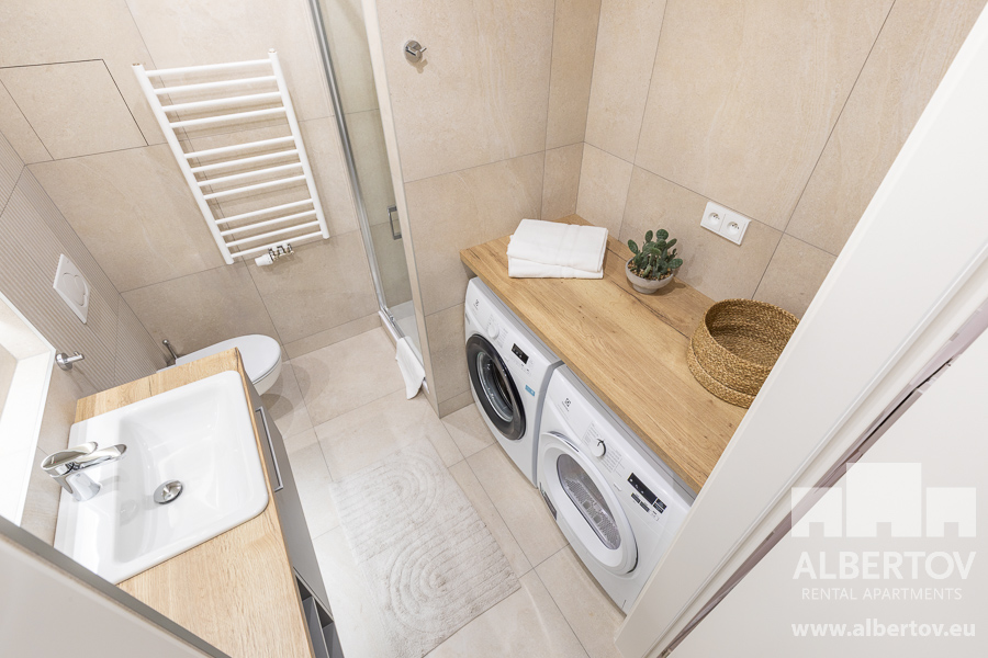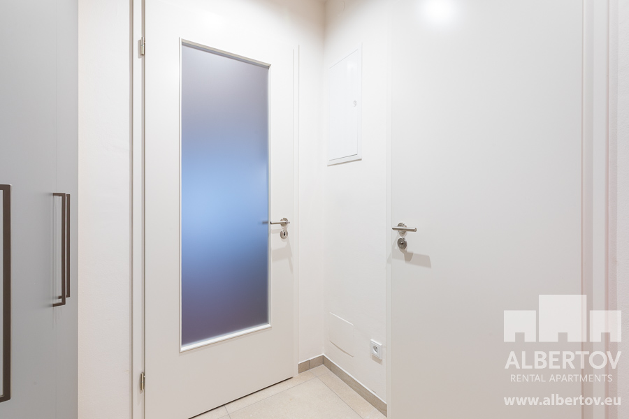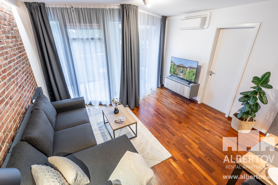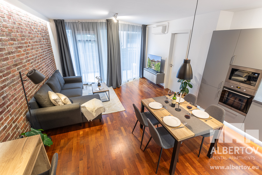 The kitchen table set with quality lighting separates the fully equipped kitchen and living room. The apartment is provided with a wine cooler, television and fast Wi-Fi network. The bedroom has bedding with a comfortable anatomical mattress which will make sure that you will have a calm sleep.