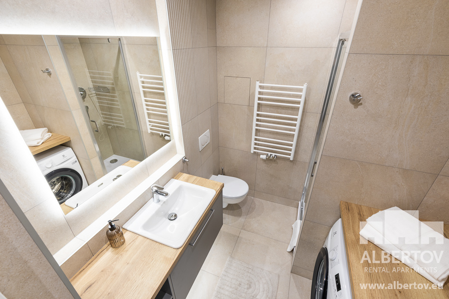 We offer you a completely furnished, modern apartment for rent for one to two people in a resident complex, which will guarantee comfort and coziness, not far away from the center of Prague. This apartment gets a lot of light and is on the second floor.