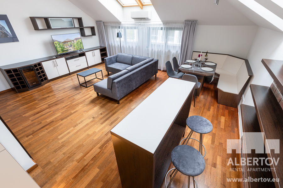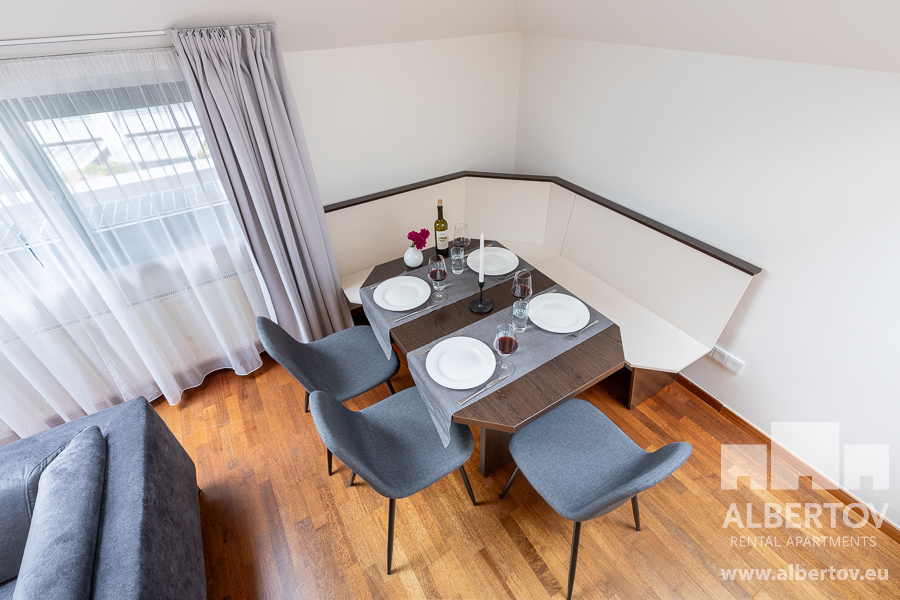 The kitchen has modern electronic appliances: electronic stove, microwave, dishwasher, cooker hood, glass ceramic disk for cooking and a refrigerator with a separate freezer. The kitchen table is in a corner with two chairs and a booth. Between the kitchen and the kichten table is a bar with a brick wall, it creates a great atmosphere. So forth, the apartment is designed with a comfortable living room set and quality furniture.