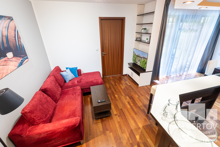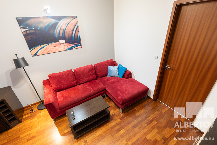 To help you live comfortably, the interior of the apartment features designer furniture, fine wood flooring with underfloor heating, and a comfortable sofa that can be used for more guests.
