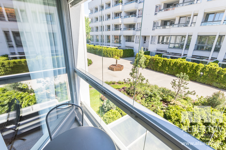 The interior of the apartment is finely furnished with modern furniture and functions in every aspect. Wooden flooring with underfloor heating, plenty of natural light provided through the large windows, and high quality lighting in the apartment.