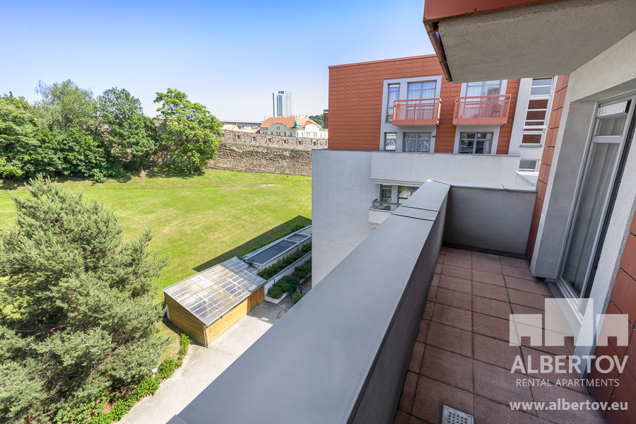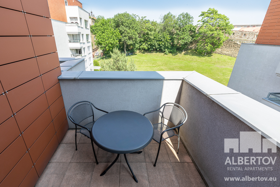 The spacious terrace, accessible from both the living room and the bedroom is furnished with outdoor furniture. The picturesque view from the fifth floor onto the Prague panorama is invaluable.