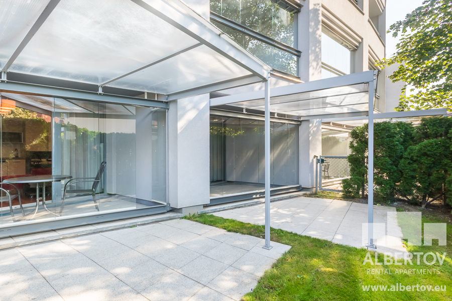 Beautiful, sunny apartment – one room apartment with a terrace and a garden for rent in Albertov Rental Apartmetns in the desired locality of Prague 2.