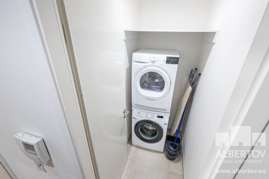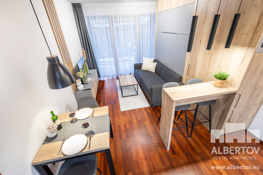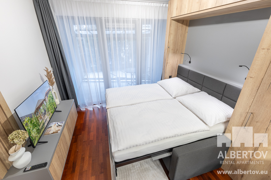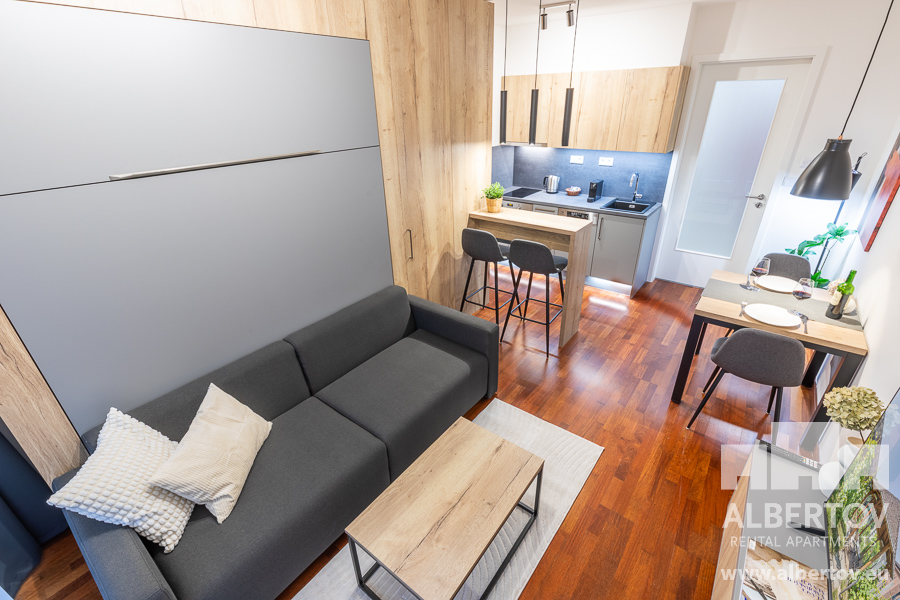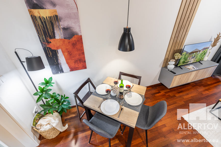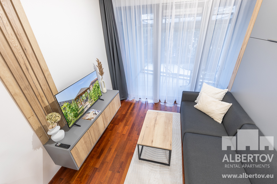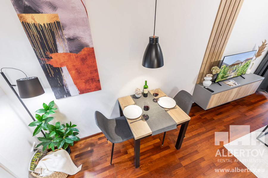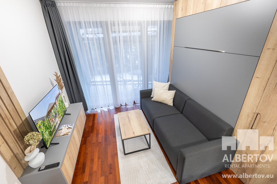 The apartment is equipped with high-quality designer furniture and for larger space the living area has a folding bed with high quality anatomically shaped mattresses.