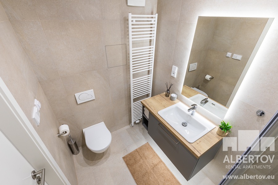 Spacious bathroom is equipped with a shower, toilet, washing machine, heating ladder, and also very complimented floor heating.