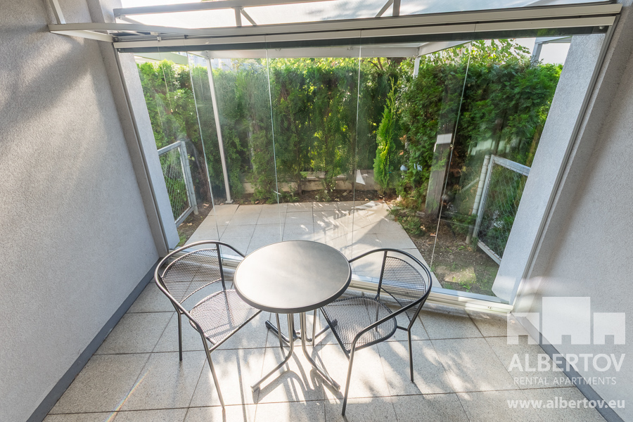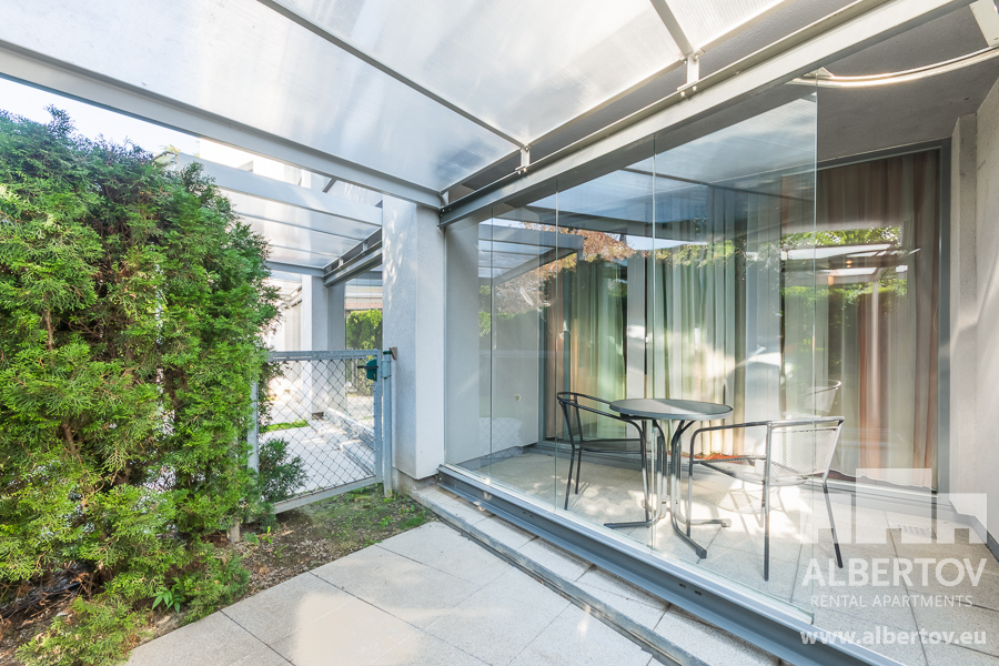 The partially covered front garden with a pleasant sitting area adds lightness and coziness to the apartment.
