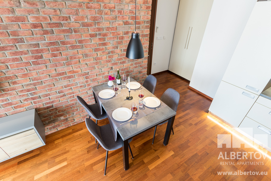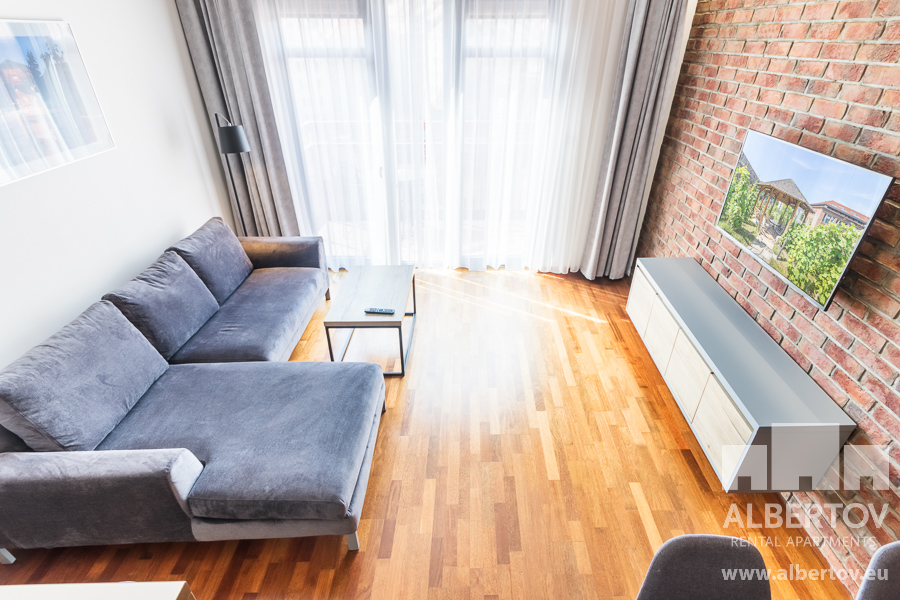 The apartment is furnished with modern furniture, high-quality wooden floors with underfloor heating, dark black out curtains and it has three balconies.