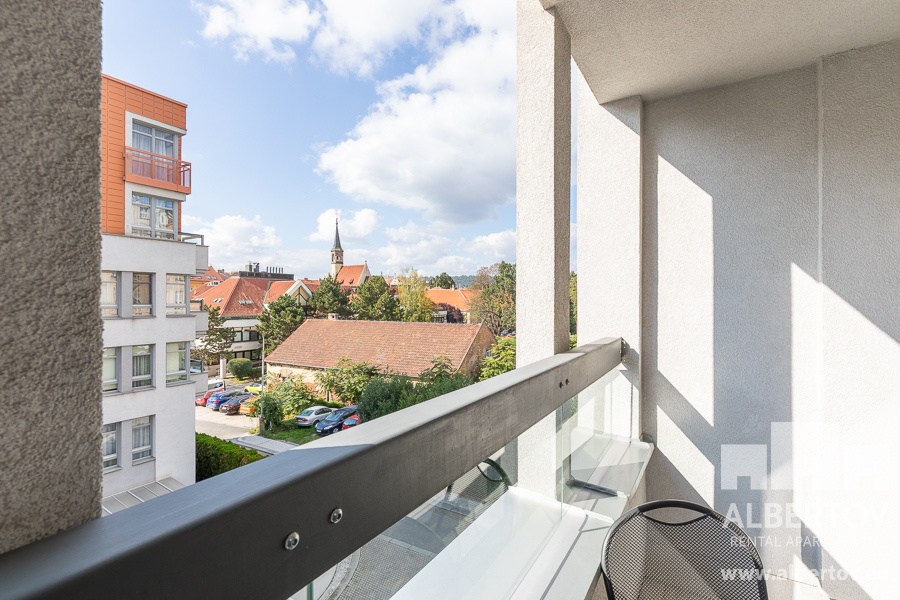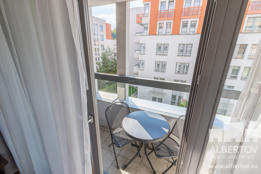 This bright apartment is located on the 4th floor of a closed residential complex Albertov Rental Apartments in a quiet part of Prague, close to the center. Shopping options, restaurant on site, with a possibility of parking under the residence, the elevator is comfortably going to bring you to the floor of your apartment.