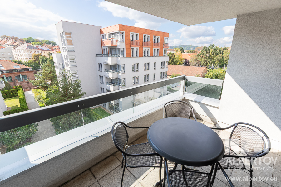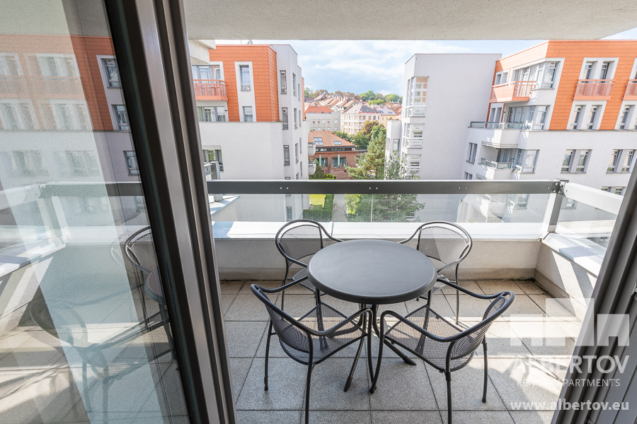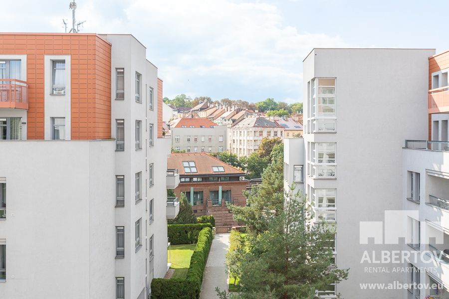 The apartment is located on the 5th floor of a brick building in Albertov Rental Apartments complex. This quiet location below Vyšehrad castle is in close proximity to the center of Prague.